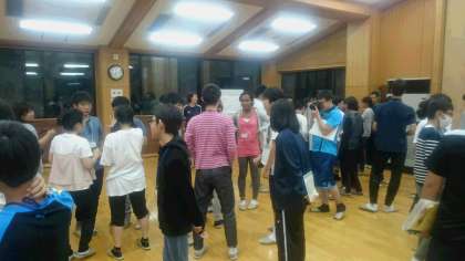 夜のレクリエーションタイムです。バースデーラインやオセロゲームで盛り上がっています。先生チームも参戦しています。
