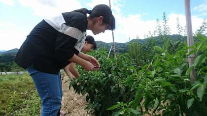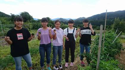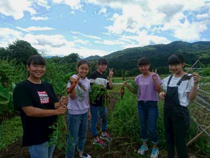 青空の下で、人参やピーマン、茄子を収穫しました。この後、近くの神社にお参りします。