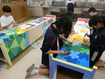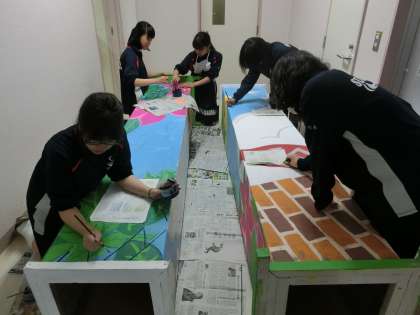 放課後美術部員は運動会の入退場門作りを行っています。部員が作成した今年のデザインもとてもすてきです!完成が楽しみです。