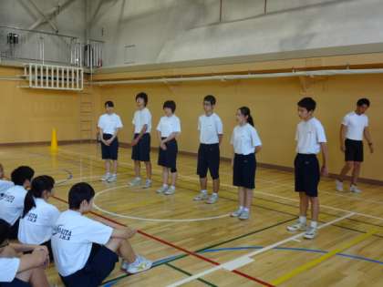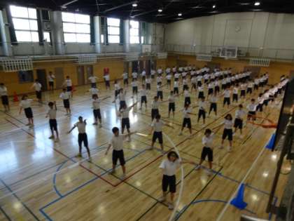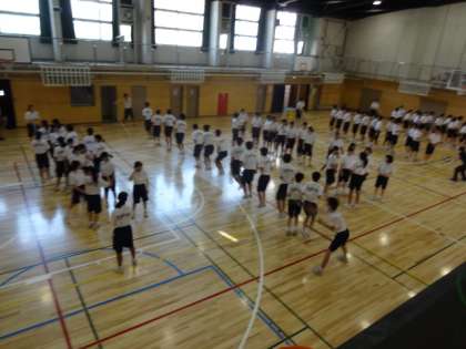 体育館でラジオ体操と大縄跳びの練習をしました。