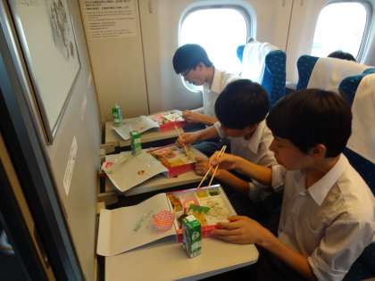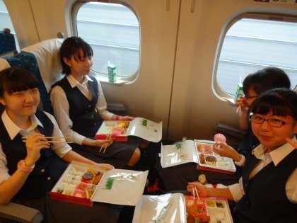 朝も早かったので、10時すぎに昼食(お弁当)になります。みんな元気で食欲もあります。ただ・・・グリーンピースは苦手な生徒が多いですが。