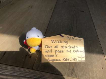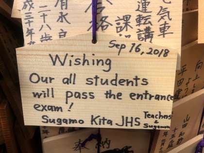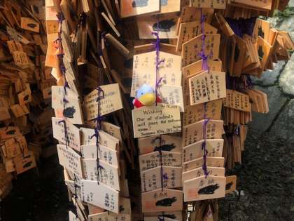絵馬を書いて、奉納しました。すがもんは英語で書いています。