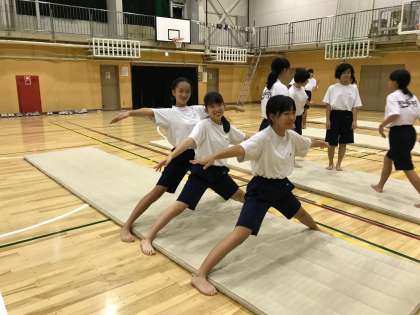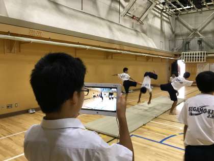 1年生保健体育は男女共習で集団マットをやっています。基礎的な技の習得の後に、「マット運動を楽しくする」というプロジェクトのもと、3、4人のグループとなり、発表会に向けて作品作りに取り組んでいます。教え合い、助け合い、タブレットによる動画撮影、創造的な活動を通して、全員がアクティブラーナーとなり、学習しています。開脚前転も3人で行うと、写真のようになります。