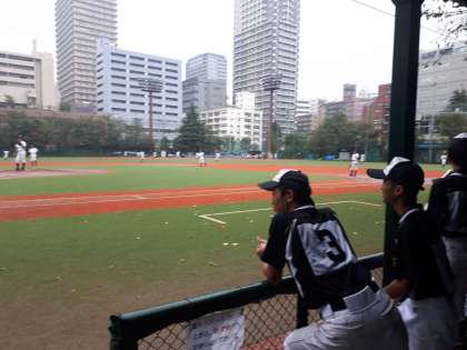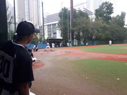 総合運動場では雨の中、準決勝が行われています。4回裏、巣鴨北中学校の攻撃中、ノーアウト三塁です。3対1でリードしています。