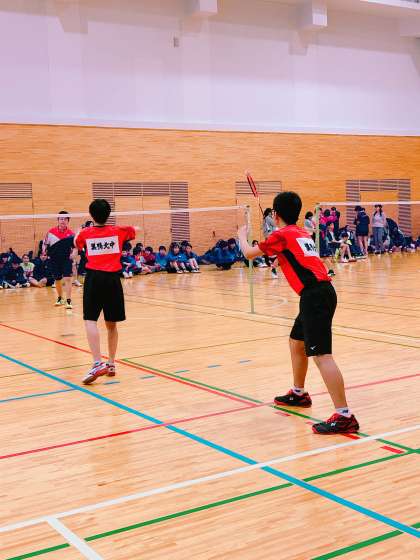 豊島区バドミントン協会主催ジュニア大会の最終戦、男女ダブルスの試合が行われています。
