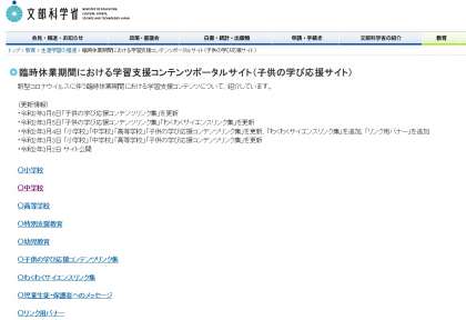 右側のリンク「子供の学び応援サイト」をクリックすると文部科学省のページに繋がります。=上の画像 是非試してください。