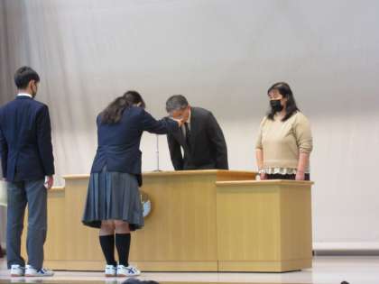 本日卒業式予行後、体育優良生徒、産業優良生徒、体育努力生徒の表彰がありました。またPTA記念品贈呈式もありました。