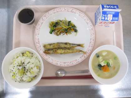 栗ご飯 ししやものごま揚げ 菊入りおひたし 呉汁 黒蜜寒天 牛乳