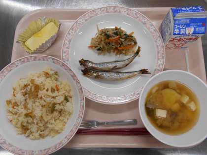 刻み稲荷ずし ししゃものみりん焼き 野菜のごま風味 みそ汁 りんご 牛乳