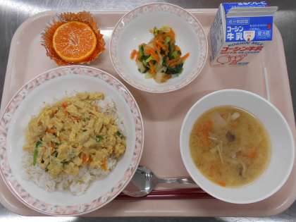 高野豆腐の卵とじ丼 みぞれサラダ 五目汁 みかん 牛乳