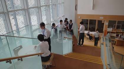 図書室が2階にわたって設計されている点 2階部分が開放されている点 学習情報センターという名称 学校の中心に設計されている点 の4点が全国的にも珍しいとのことで図書室が研究対象となりました。貸出冊数だけでなく、図書室の利用の仕方も研究対象とのこと。図書室で行う授業や、各教室での授業も情報収集し比較・検討に入っています。只今、解析中で結果は来春に発表可能とのこと。楽しみです。