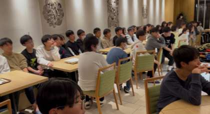 本日の全体的な流れを踏まえて、反省点や明日の動きの修正点などを共有しております。宿泊行事ということもあり、いつもよりはテンションが高い様子ですが、大切なところはおさえようとする雰囲気が見られます。