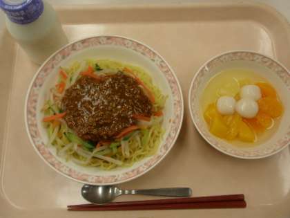 ジャージャー麺は給食人気メニューの一つです。肉みそをおいしく作るコツはじっくり煮込むことです。