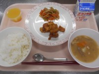 そぼろ・炒り卵・野菜炒めの三色丼を作りました。豚ひき肉を使い、こくがあり、ごはんが進むそぼろに仕上がりました。470人分の炒り卵を、細かくきれいに作ることはとても大変な炒り作業ですが、調理員さんたちが一生懸命作ってくれました。