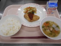 もみじごはん魚のもみじ焼き油揚げのピリ辛サラダ豚汁牛乳木々の葉も黄色や赤に装いが...