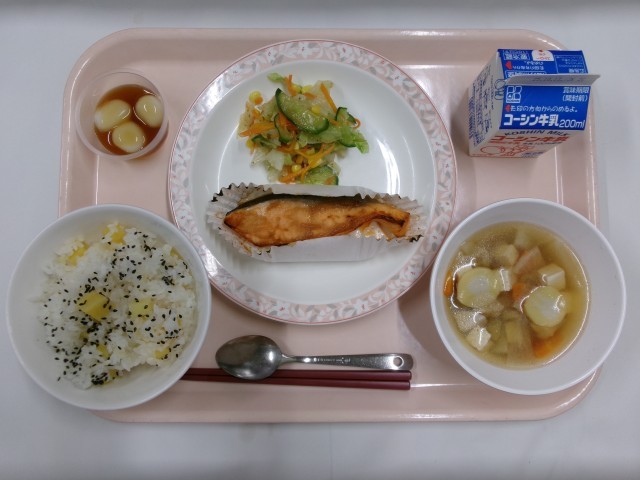 さつま芋ご飯、魚の西京焼き、しそドレサラダ、けんちん汁、みたらし団子、牛乳