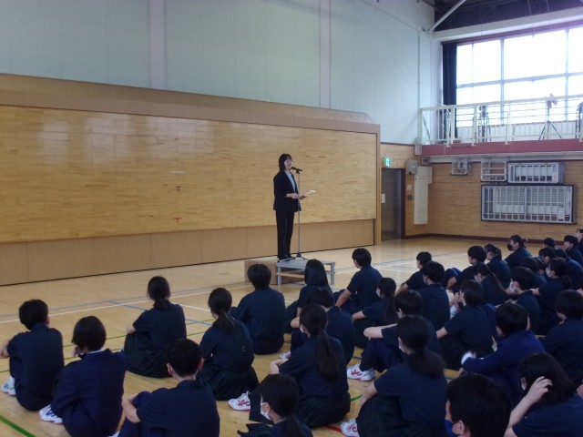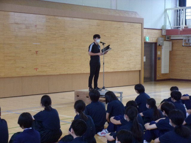 「中秋の名月」合わせて、校長先生からは「月と同じように、同じ人でも見る角度によって違う感情が見えることがある。笑顔でいても、実は何か悩みを抱えているかも知れない。互いの気持ちに寄り添える人になりましょう」というお話がありました。生活指導部からは、服装、休み時間の過ごし方、小中連携バラ見守り隊(巣鴨小とのボランティア清掃活動)について連絡しました。