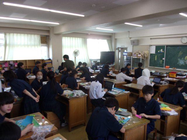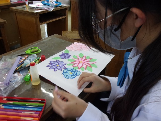 「折り紙で貼り絵を作る」という課題について、一人ひとりが考えた様々なデザインを貼り絵で表現したり、早く完成した生徒はさらに絵の具や折り紙の立体物で完成度を高めていました。