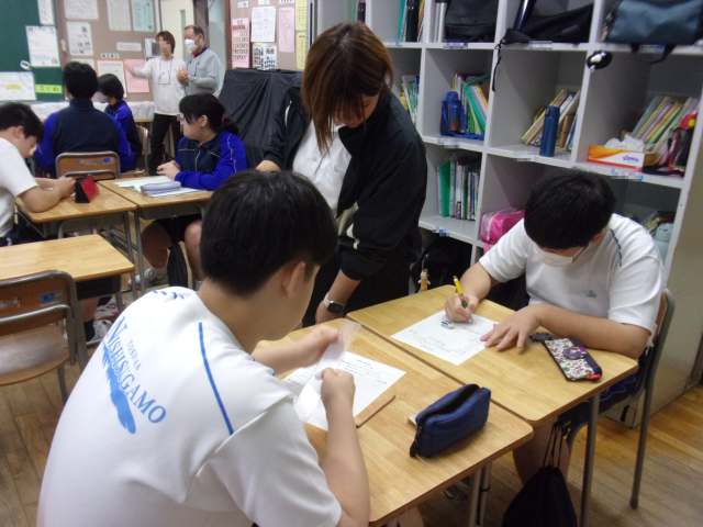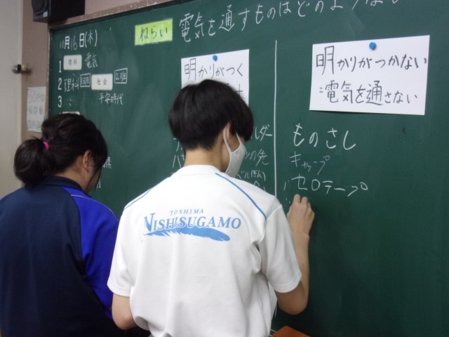 1校時は4組の理科の授業です。「電気を通すものは、どのようなものだろうか?」というめあてについて、生徒たちは教師の提示した教材以外に、身近にあるものが電気を通すのかどうか実際に調べて黒板やワークシートにまとめました。