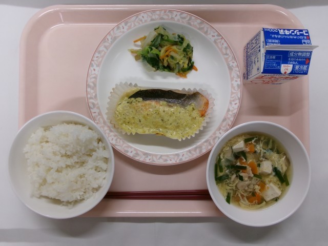 ご飯、魚のきのこマヨ焼き、野菜のからし和え、にらたま汁、牛乳