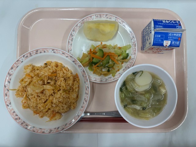 じゃこ入りキムチチャーハン、パリパリサラダ、トックと白菜のスープ、果物(りんご)、牛乳