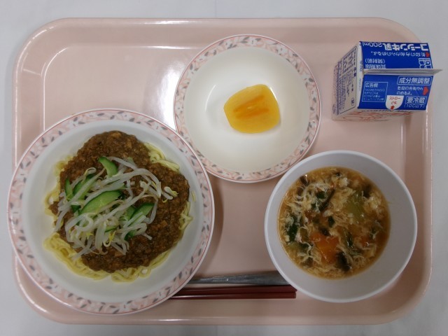 ジャージャー麺、酸辣湯、果物(柿)、牛乳