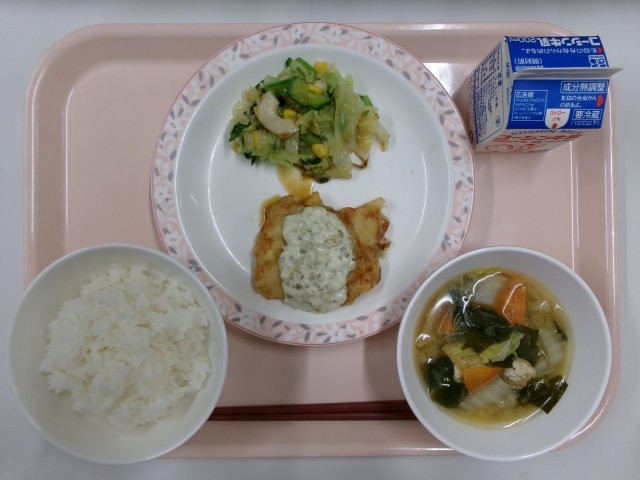 ご飯、チキン南蛮、竹輪と野菜の酢の物、大根と白菜のみそ汁、牛乳