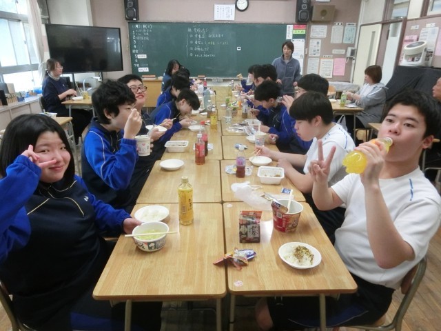 また、昼食には防災教育の一環として学習した「防災食・備蓄食」を事前の買い物学習で購入して喫食。お湯を注ぐだけですぐに食べられる備蓄食品の便利さを意識して食したカップ麺などは、また一味違ったようです。今日1日で得た多くの学びを生かして、日常生活を送るうえで必要な力を身に付けていきます。