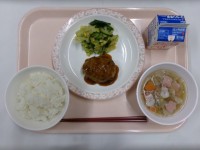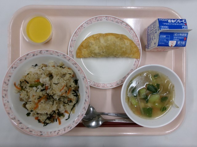 野沢菜チャーハン、ジャンボ揚げ餃子、中華スープ、マンゴープリン、牛乳