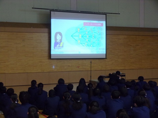 校長先生からは、新聞記事を題材に「得られた情報について、自分で考えて判断することが大切である」というお話をしました。続いて、SNSの危険性についての動画を視聴した後、生活指導主任からトラブルの加害者・被害者にならないための心構えや行動についてお話ししました。