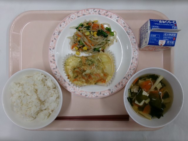 麦ごはん、鶏肉の味噌チーズ焼き、じゃこ入りお浸し、すまし汁、牛乳