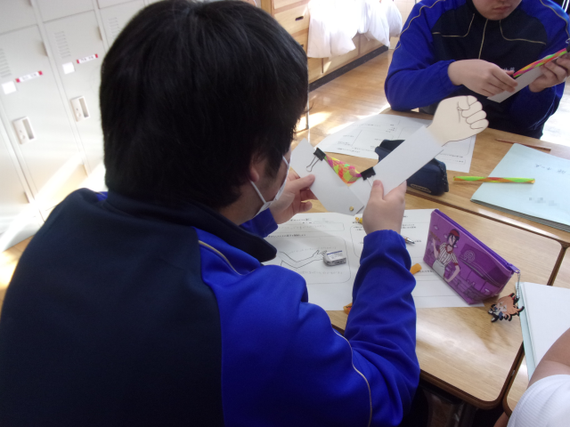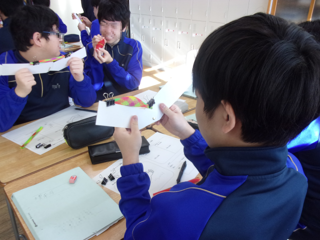 骨と筋肉の関係について、生徒たちは自分の腕と自作模型を比較しながら思考していました。