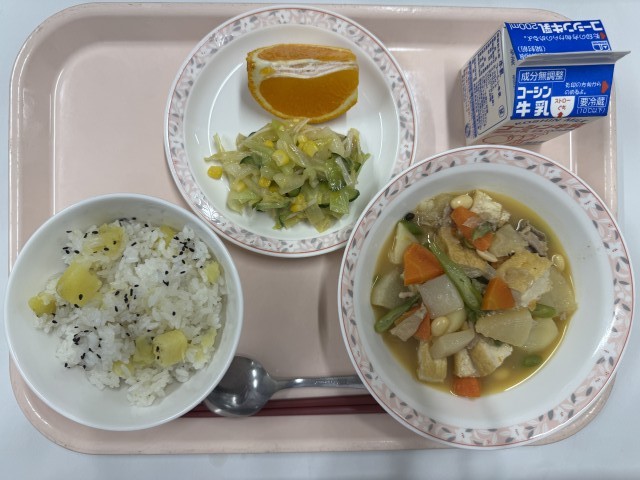 さつま芋ご飯、五色煮、みそドレサラダ、果物(デコポン)、牛乳