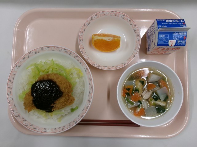 みそかつ丼、のっぺい汁、果物(せとか)、牛乳