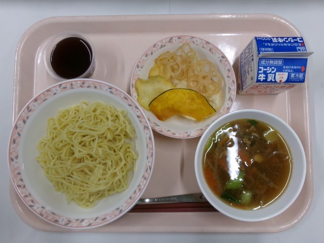 しょうゆラーメン、野菜チップス、ぶどうゼリー、牛乳