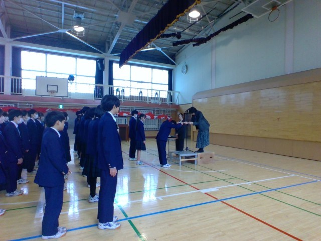 修了式では、校長先生から代表生徒に修了証が手渡されました。