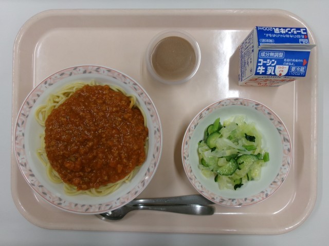 スパゲッティ・ミートソース、グリーンサラダ、ココアミルクゼリー、牛乳