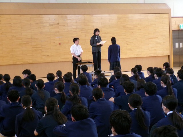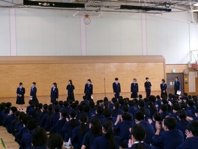 各専門委員会の委員長が校長の秋庭先生より認証状を受け取り、全校生徒の前で委員長としての抱負を述べました。