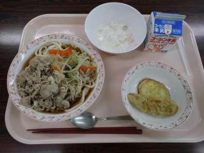 スタミナサラダうどん さつまいも&ささかまの天ぷら ナタデココヨーグルト 牛乳