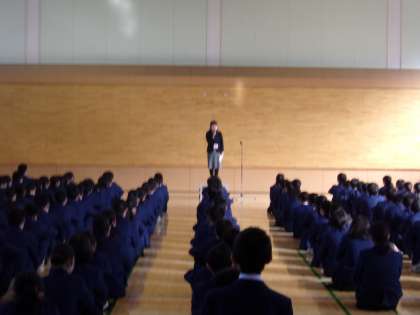 「2学期を振り返ると、日々の授業だけではなく、さまざまな行事に取り組みました。その一つ一つがみなさんの頑張りで取り組めました。そしてその経験はとても大切なことです。努力は、必ず自己ベストとなって自分に返ってきます。健康で有意義な冬休みを過ごしましょう。」