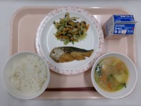 《今日の給食》ご飯、魚のもみじ焼き、ブロッコリーとひじきの和え物、なめこと豆腐の...