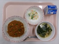 《今日の給食》チリビーンズライス、ポテトサラダ、大根とわかめのスープ、牛乳今日の...