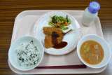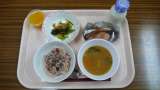わかめじゃこごはん、鯵(アジ)フライ、コーン入りおひたし、白菜のみそ汁、牛乳