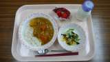 チキンカレーライス、ほうれん草とコーンのサラダ、いちご、牛乳 今日はカレーだ!...