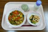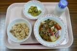 ビビンバ、五目中華スープ、フルーツヨーグルト、牛乳 ビビンバの具は、豚肉、豆も...