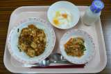 麻婆豆腐丼、バンバンジーサラダ、杏仁豆腐、牛乳 今日の麻婆豆腐丼のごはんは、大...