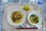 シーフードクリームスパゲティ、ハム入りサラダ、さくらんぼ、牛乳 今日の果物はさ...