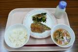 ごはん、鯵(あじ)のカレー揚げ、海藻サラダ、白菜と小松菜のみそ汁、牛乳 鯵はほ...