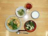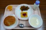 きつねうどん、枝豆入り卵焼き、コーン入りおひたし、白玉入り水ようかん、牛乳 水...