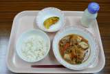 麦ごはん、肉豆腐、かぼちゃの天ぷら、牛乳 今日のかぼちゃは、茨城県産(一部、静...